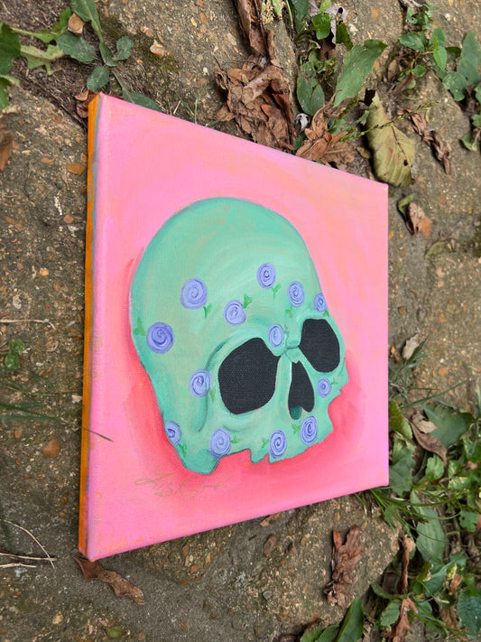 Green Skull with Purple Flowers
