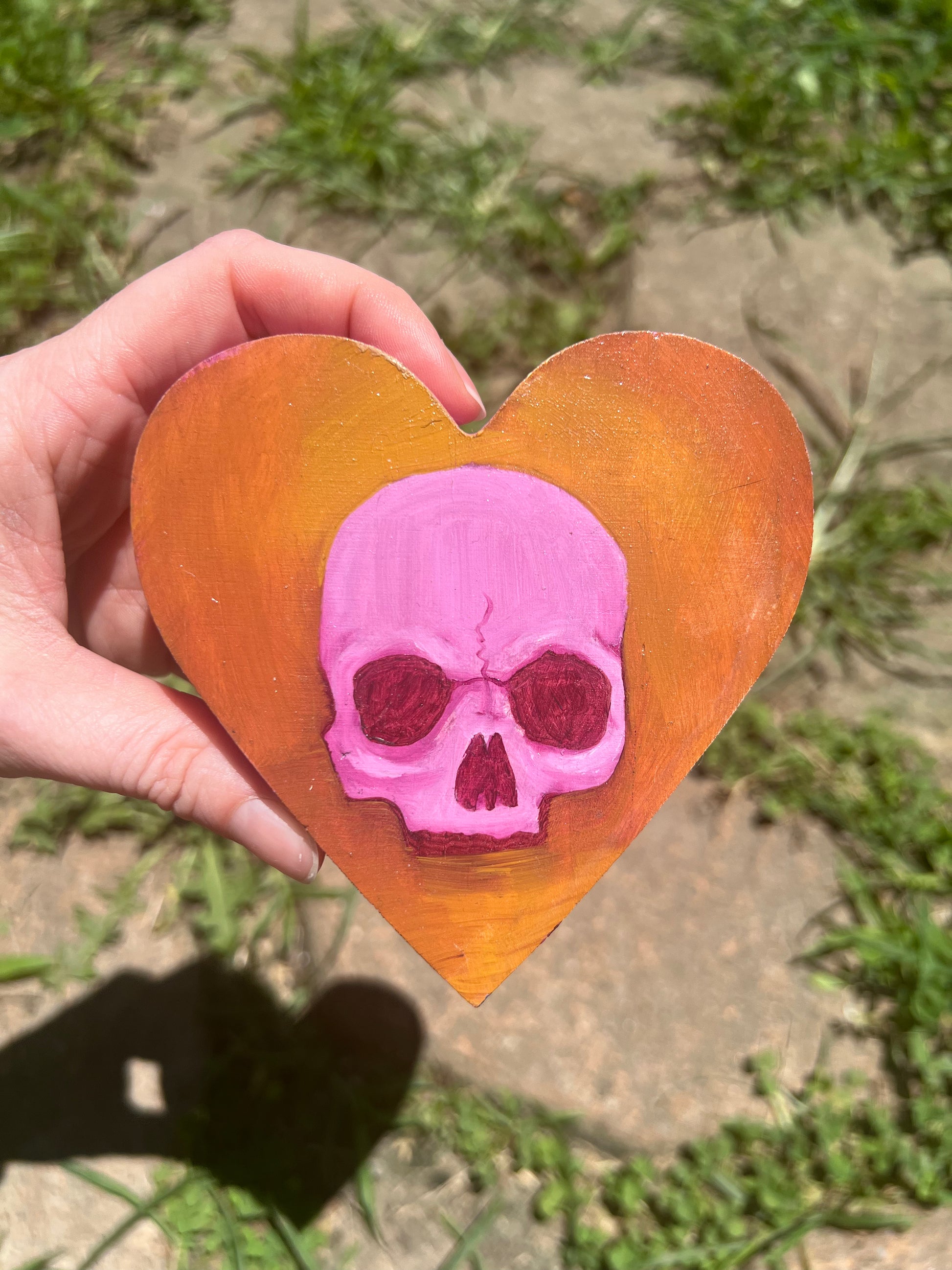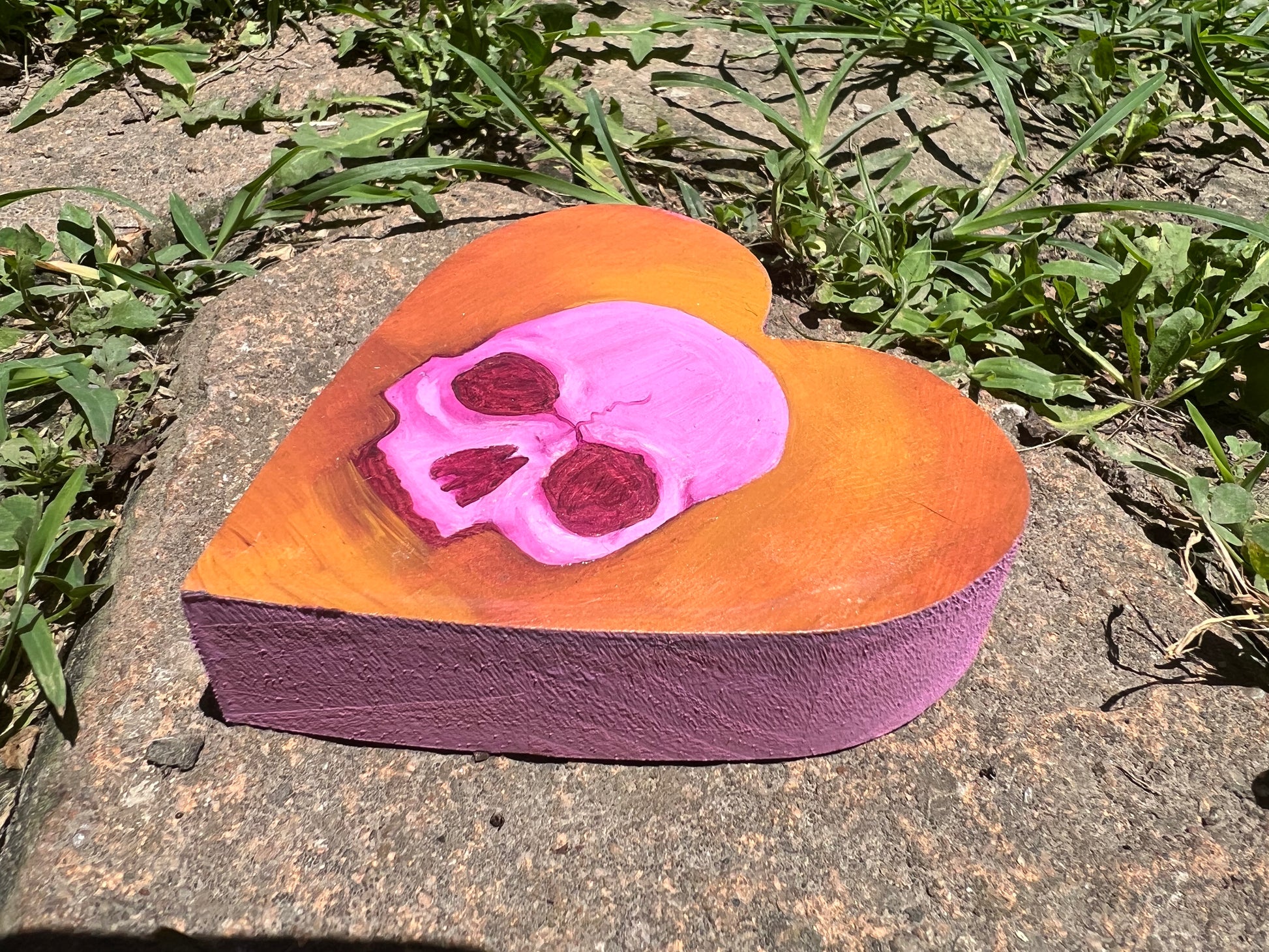 Skull oil painting on primed wooden heart. The heart is about 4” wide, almost 4” tall, and 1 inch thick. The edges were recently finished by color matching the skulls, but the edges were done in acrylic. The skull painting is varnished. It is stamped signed and dated on the back.