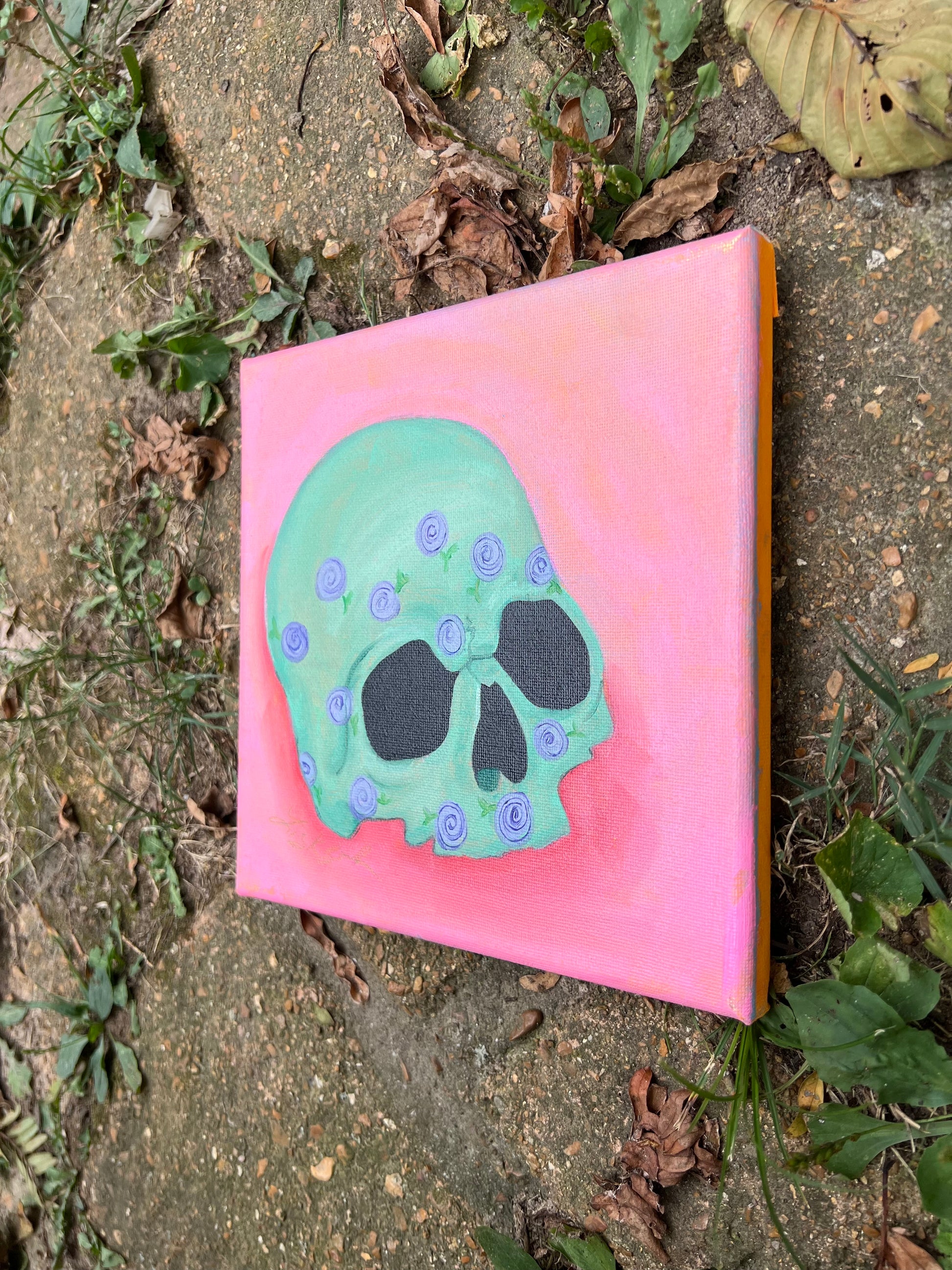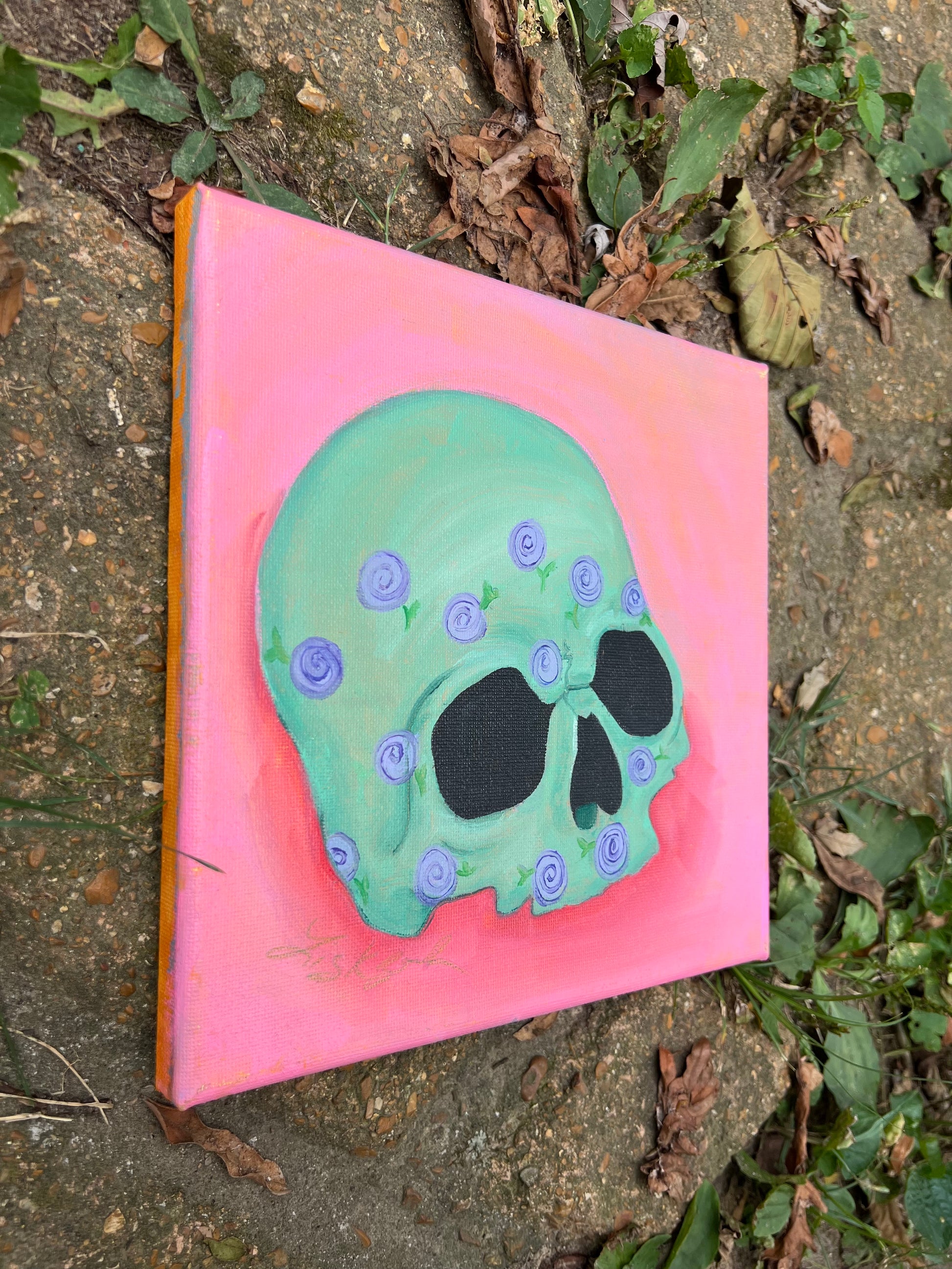 Green Skull with Purple Flowers is a painting of… a green skull with purple flowers on a salmon-ish color background on 8” by 8” by 5/8” thick stretched canvas.