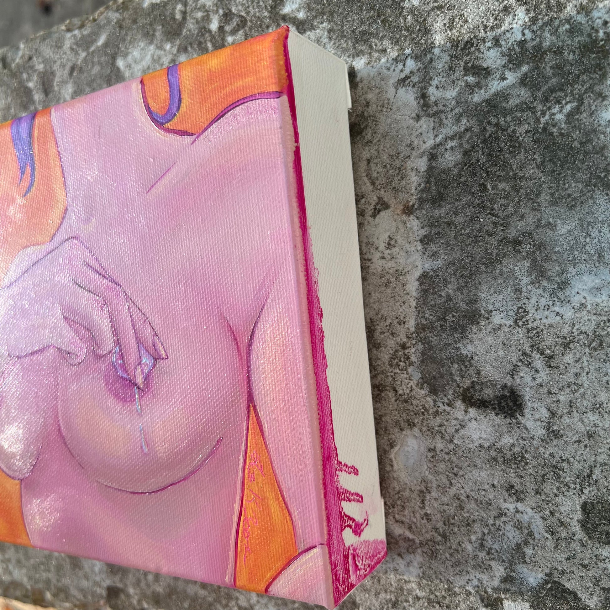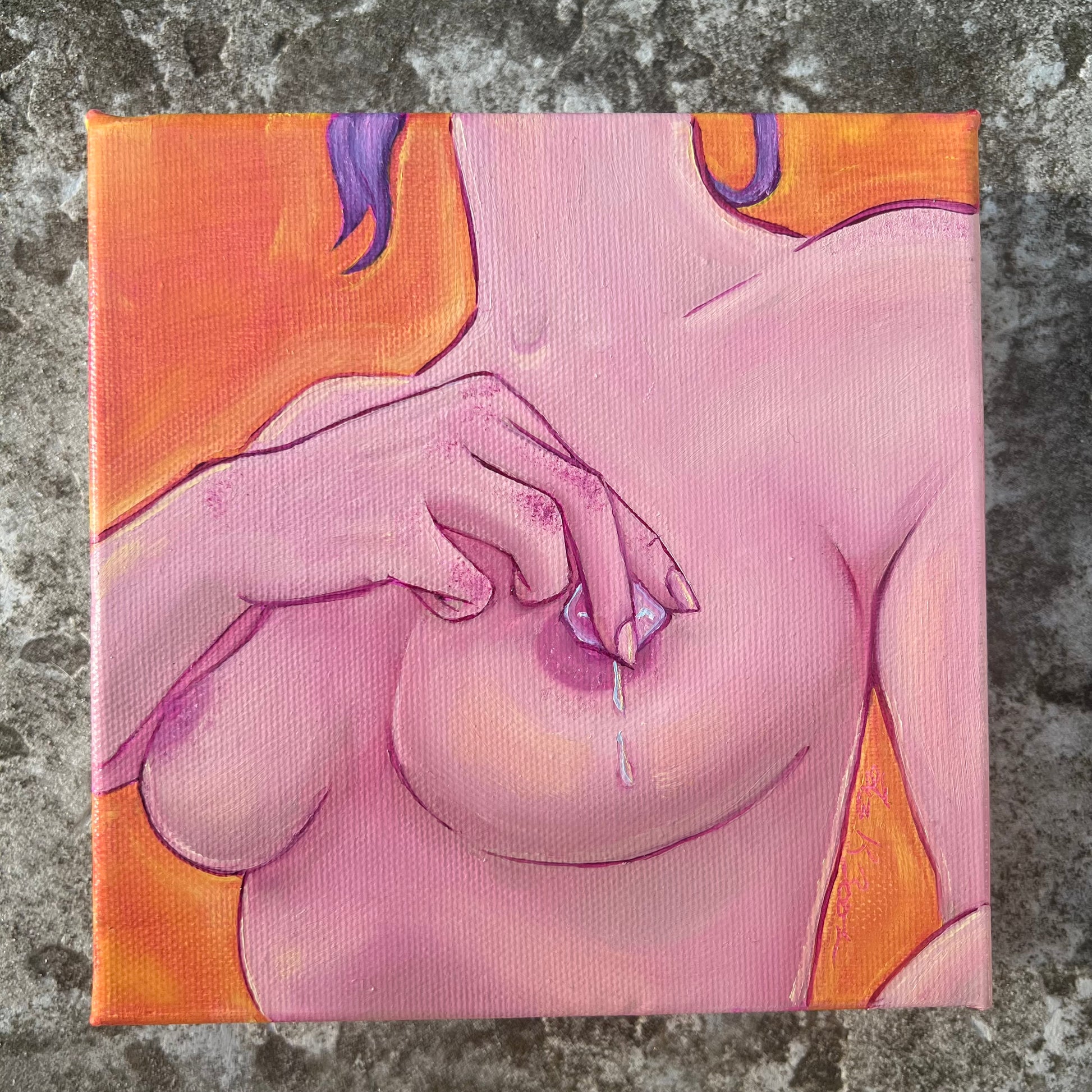 Ice, Ice Baby is an oil painting of a person rubbing ice on their nipple. It is painted on 6” wide by 6” high by 1.5” deep canvas.