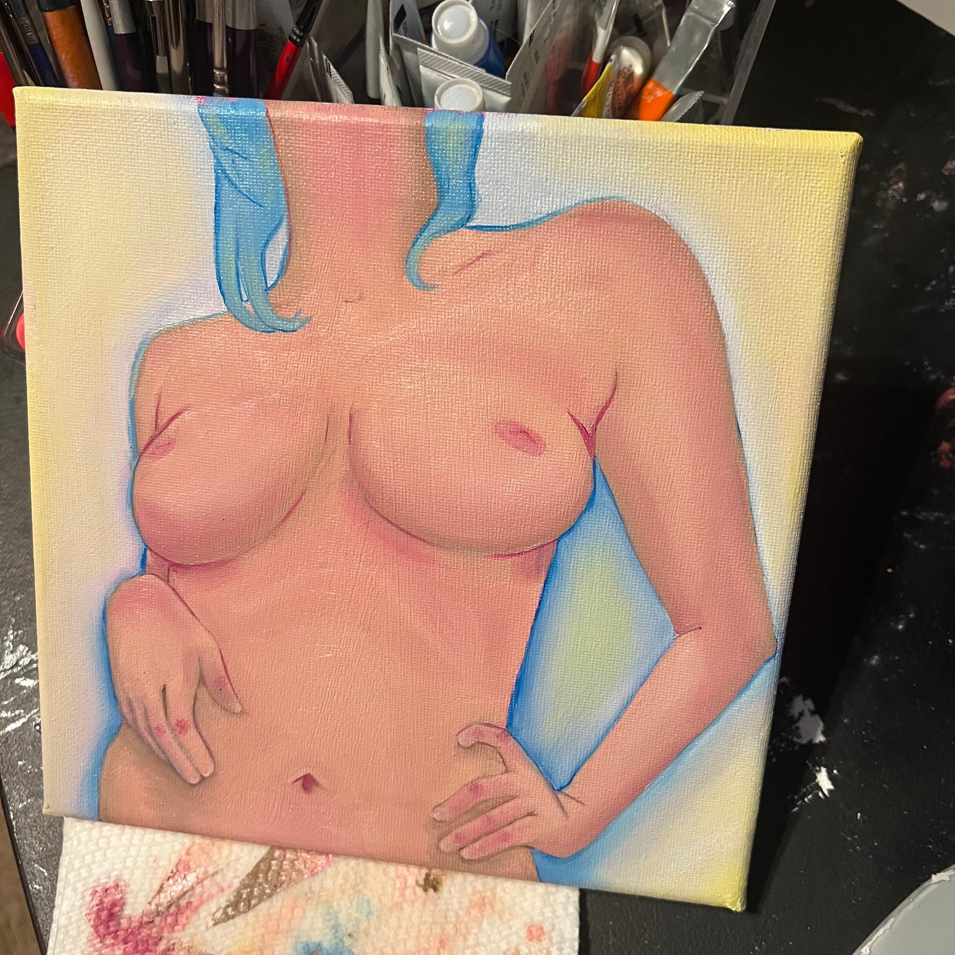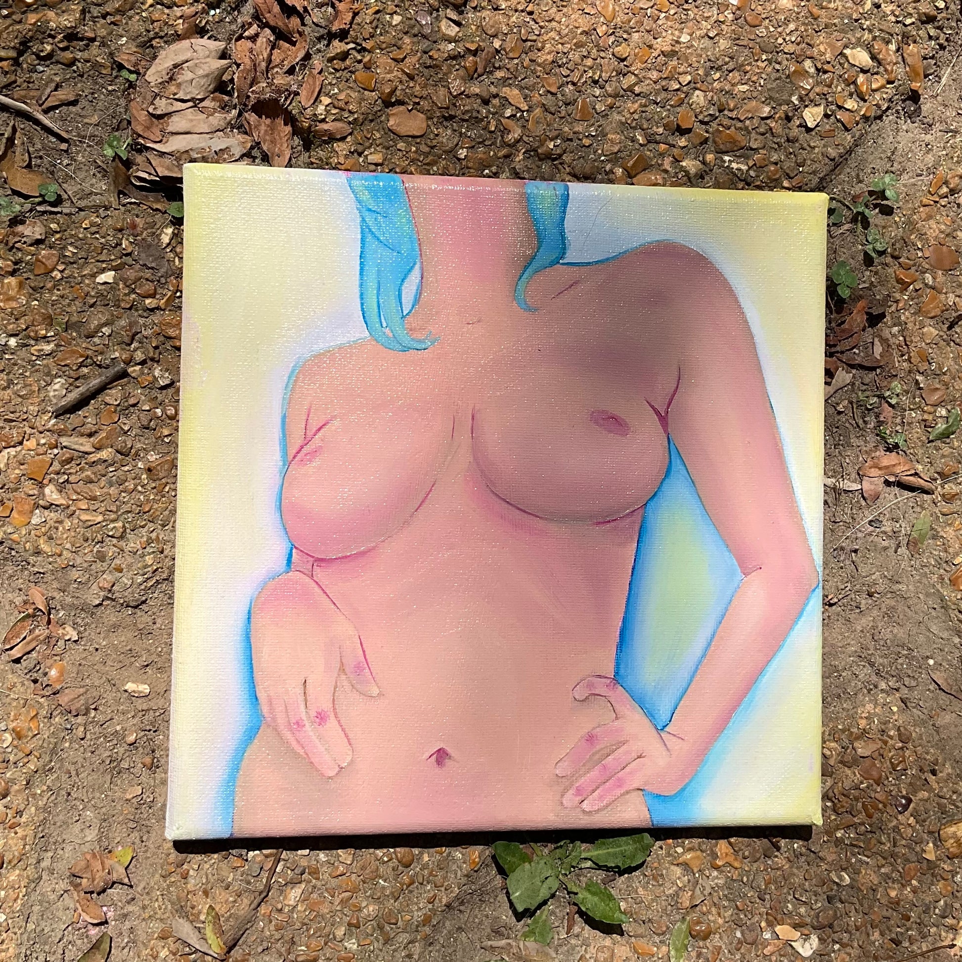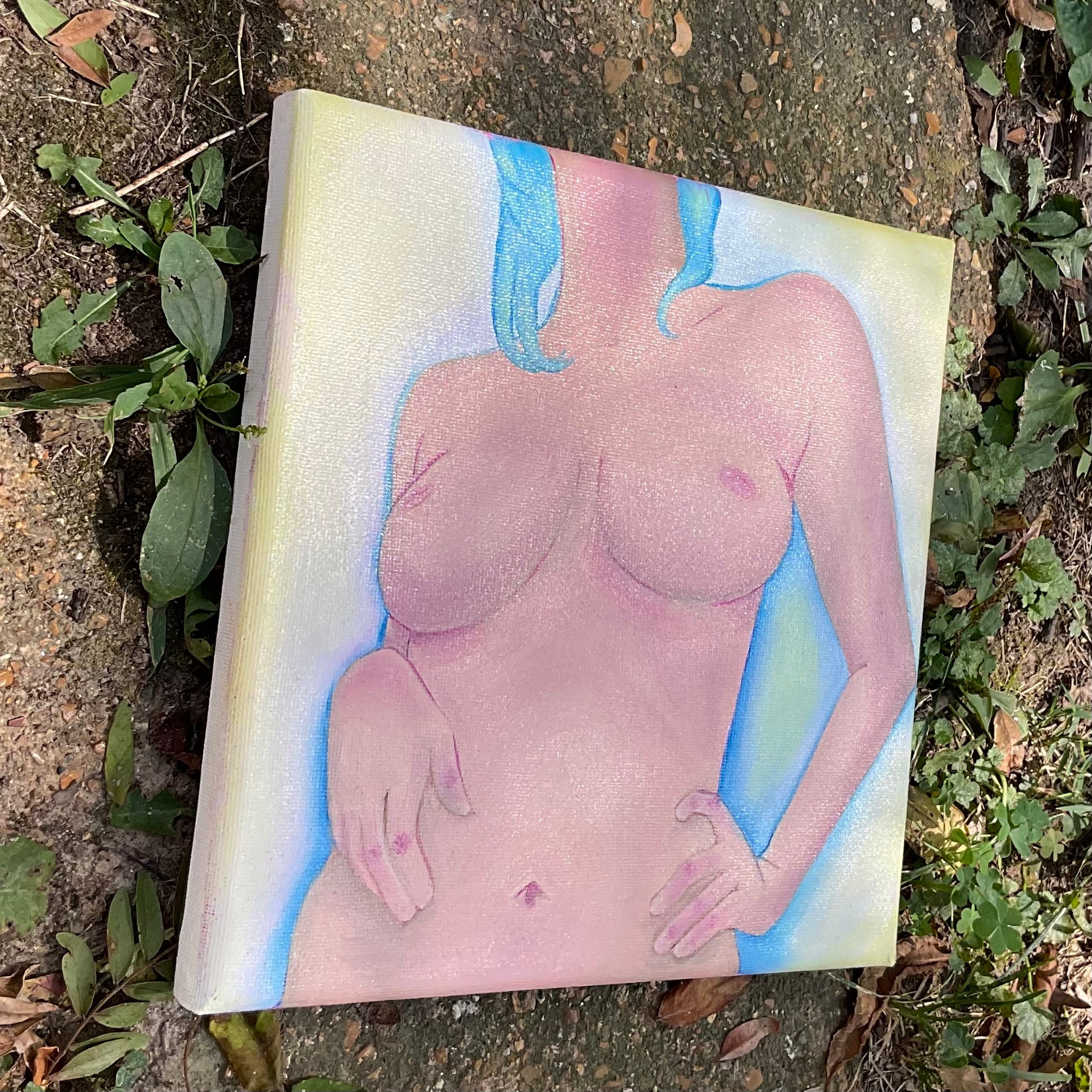 Neon Dreams is an oil painting of a nude on 8” by 8” stretched canvas.