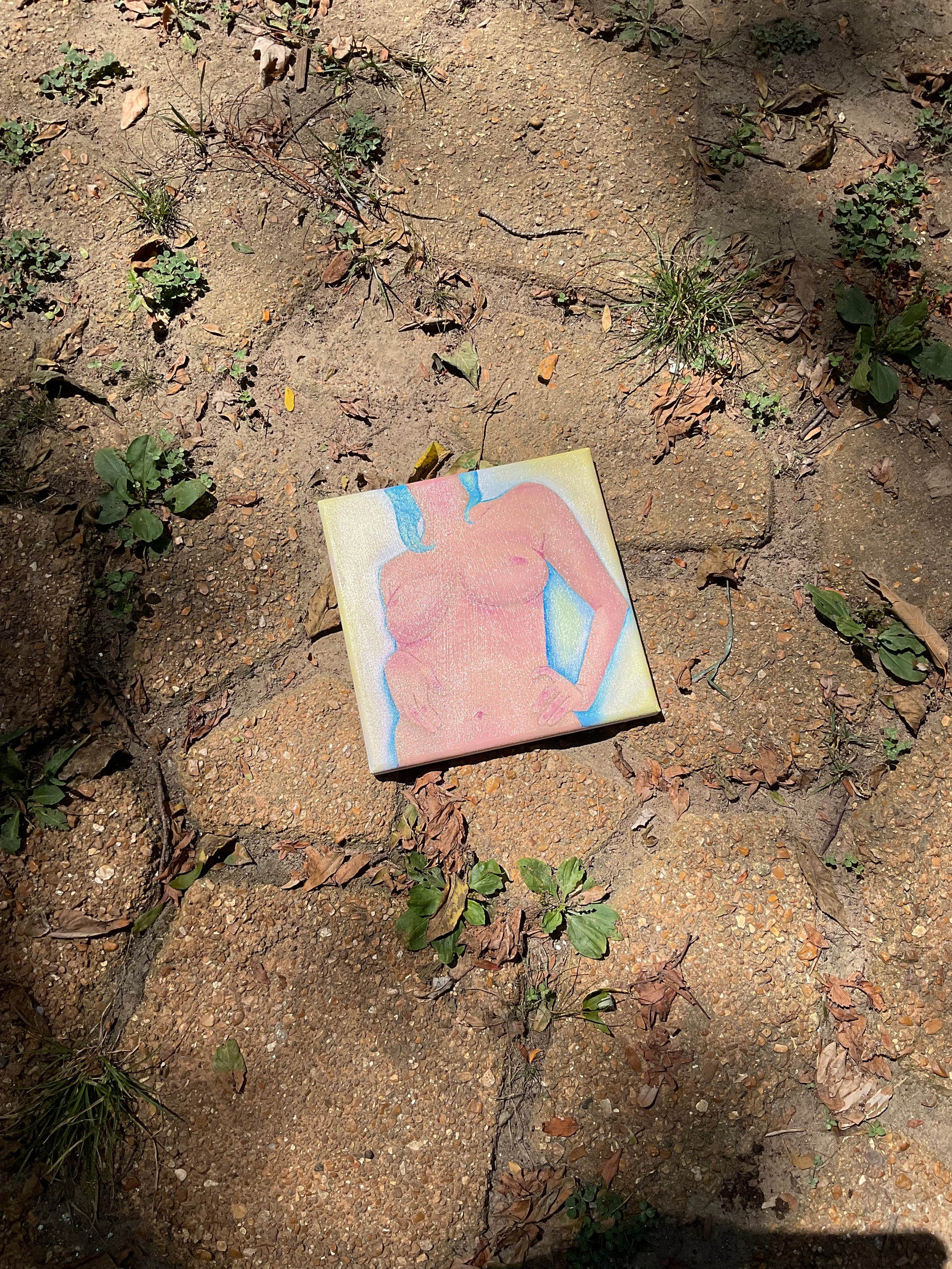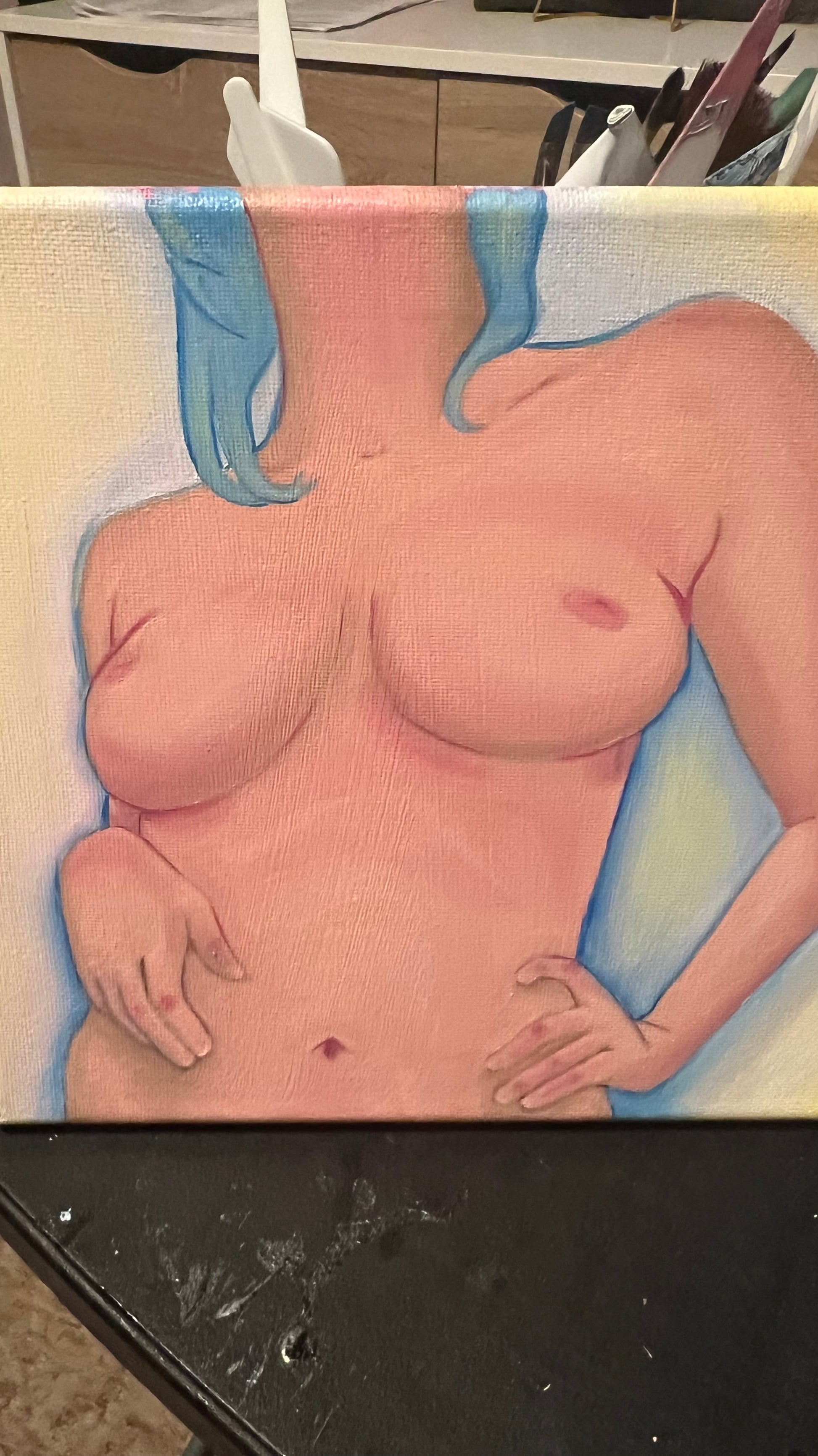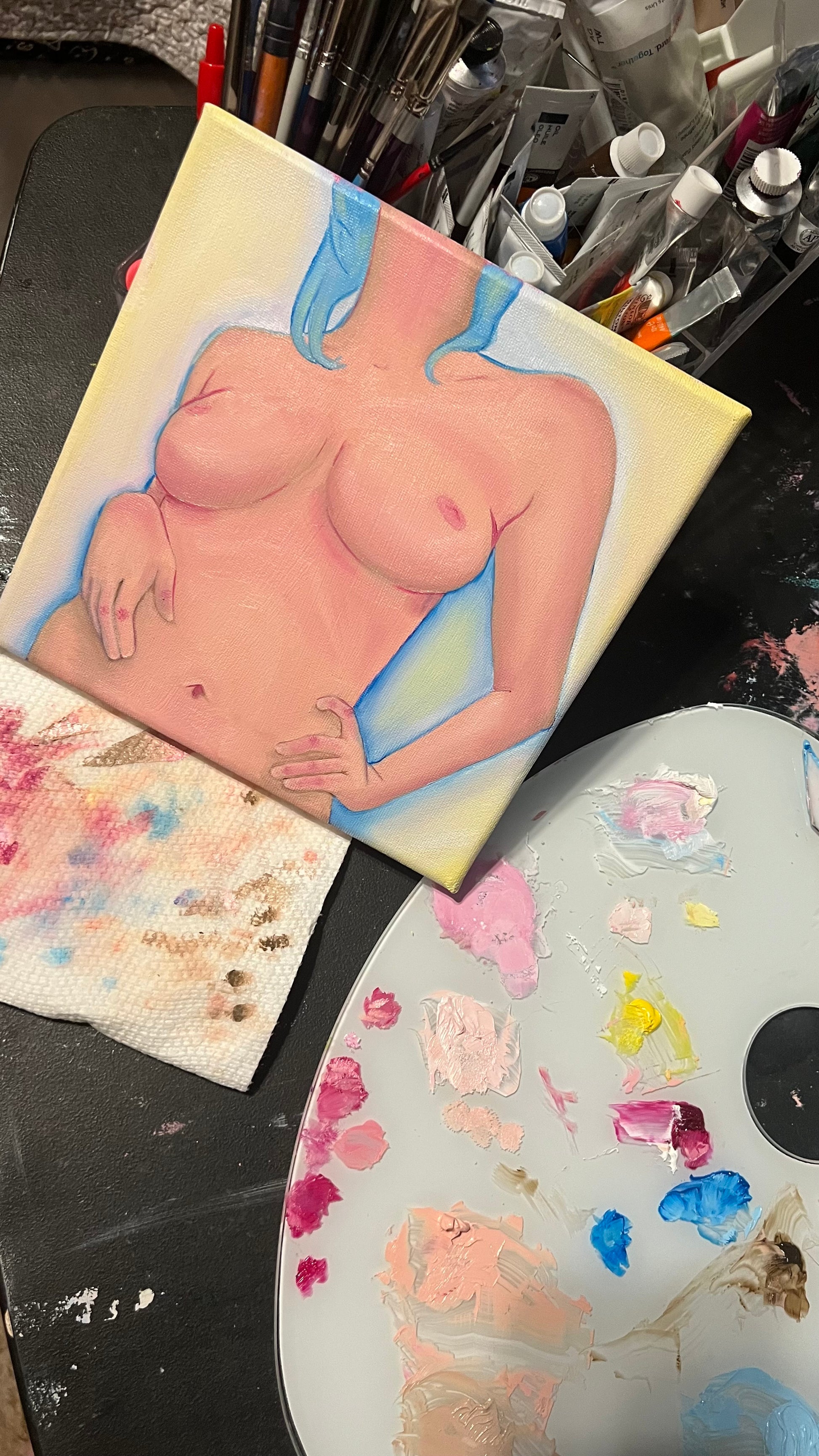 Neon Dreams is an oil painting of a nude on 8” by 8” stretched canvas.