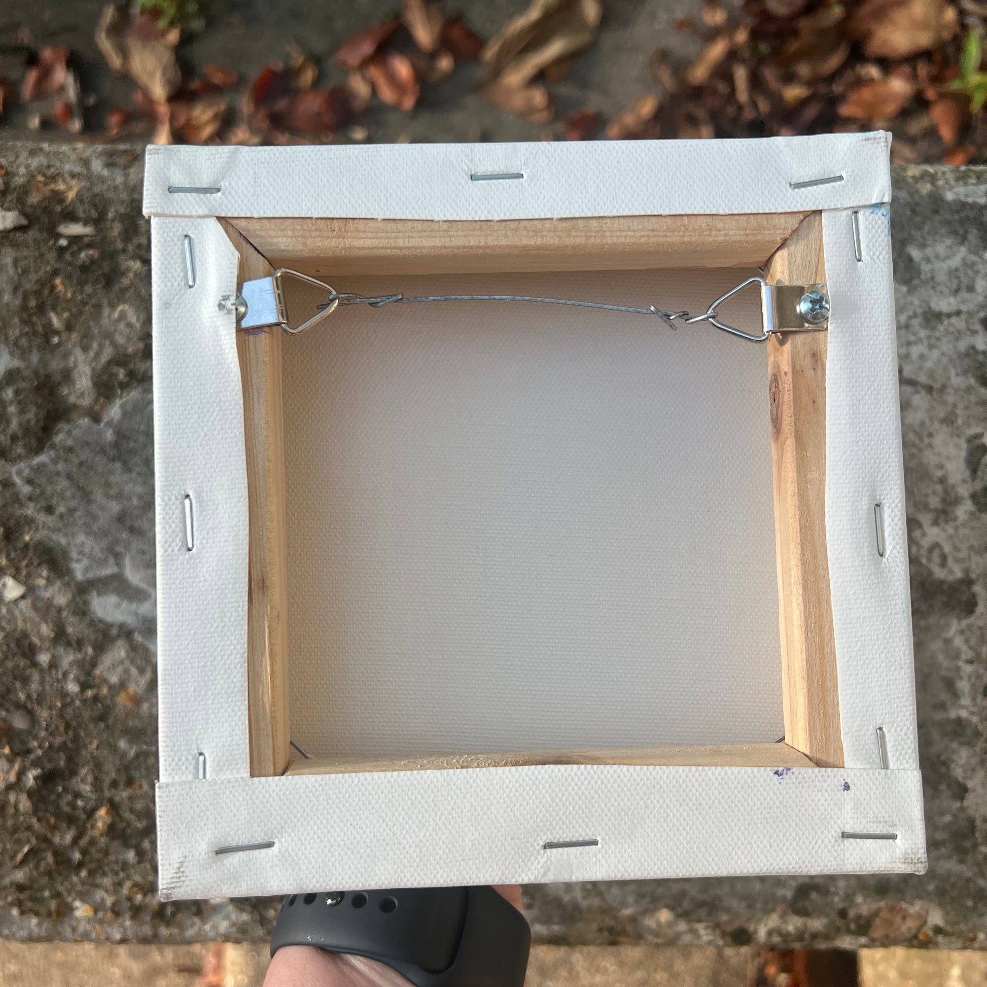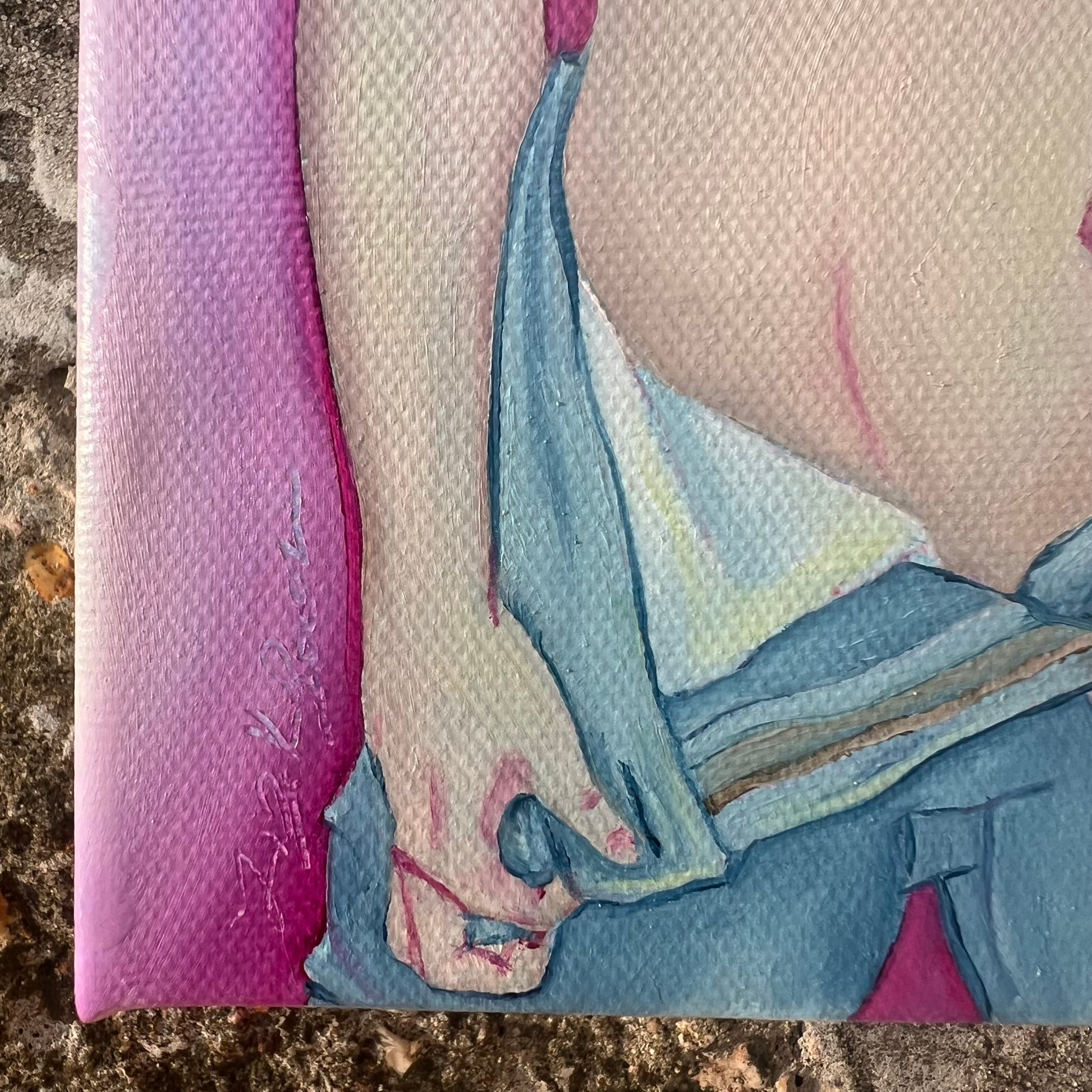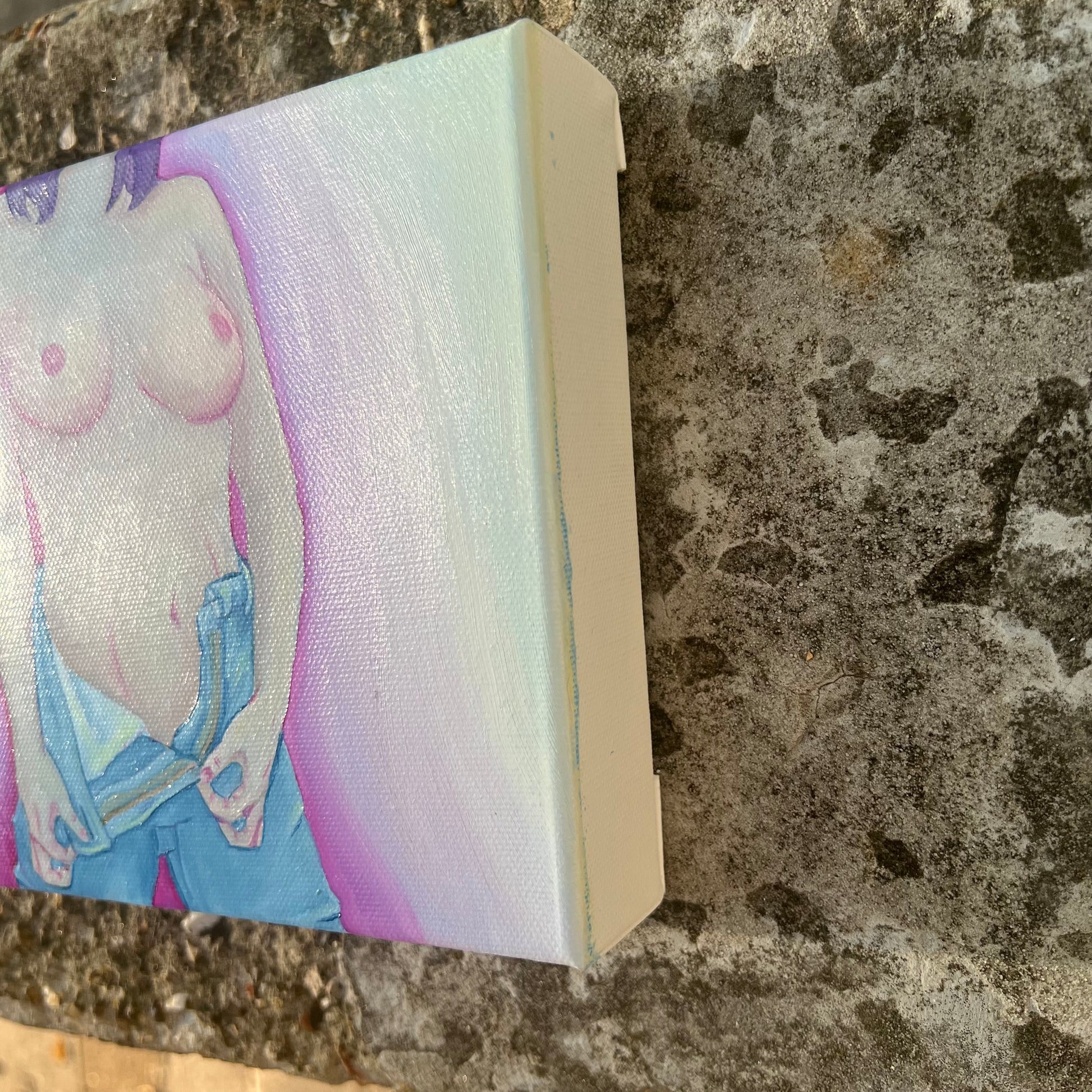 It is painted on 6” wide by 6” high by 1.5” deep canvas. It was completed in 2025.