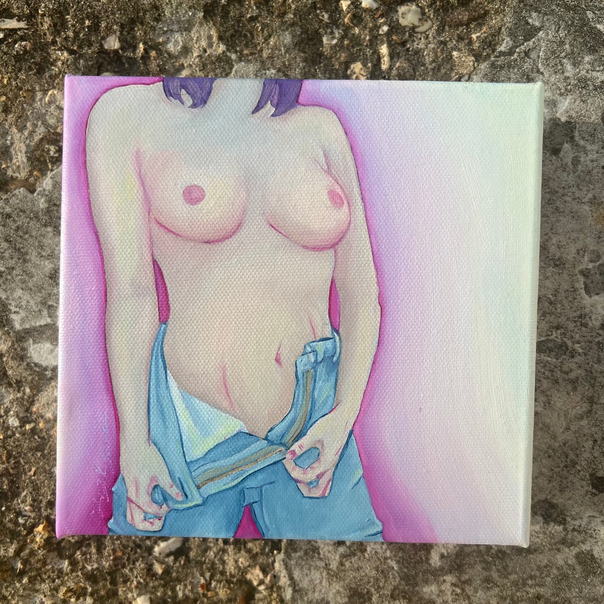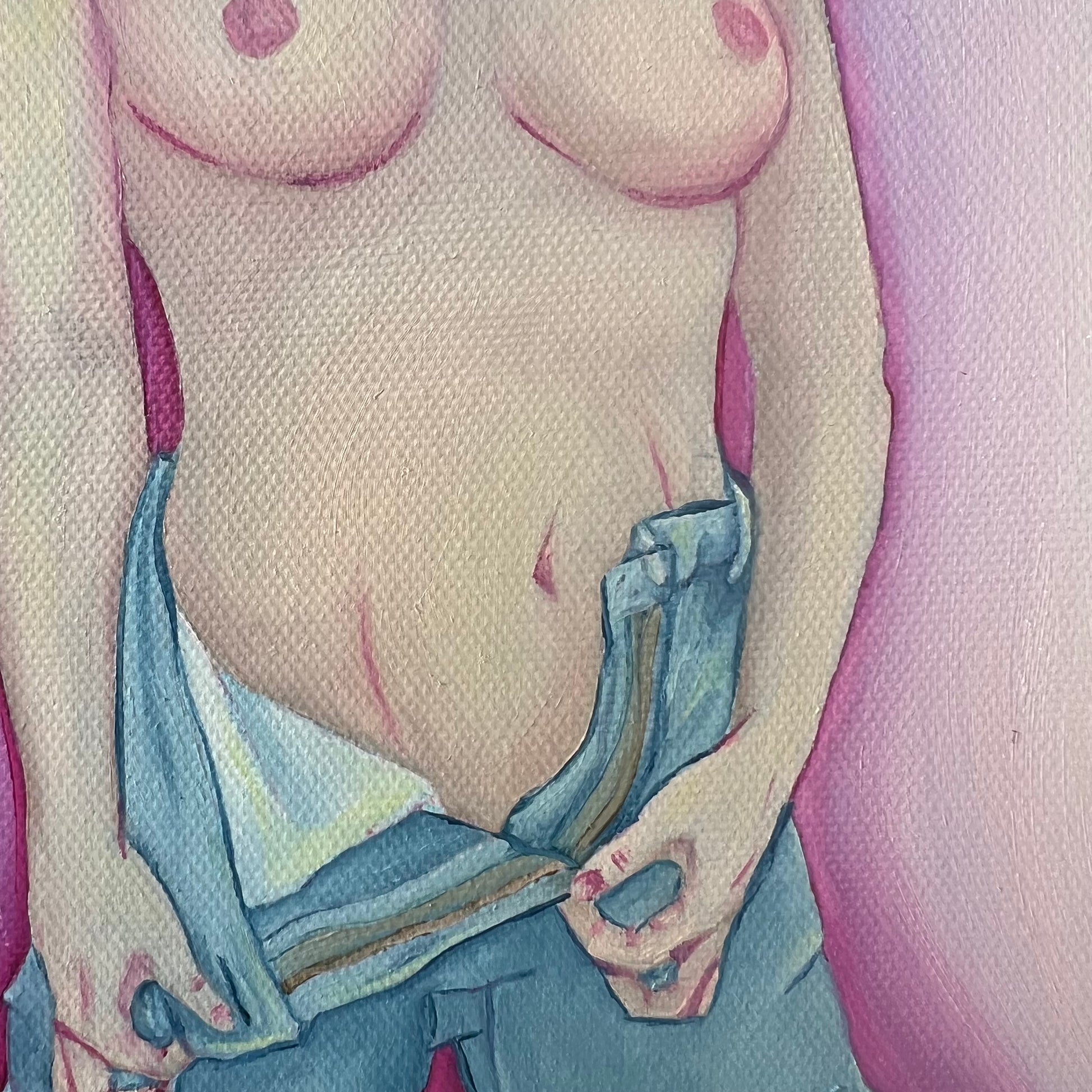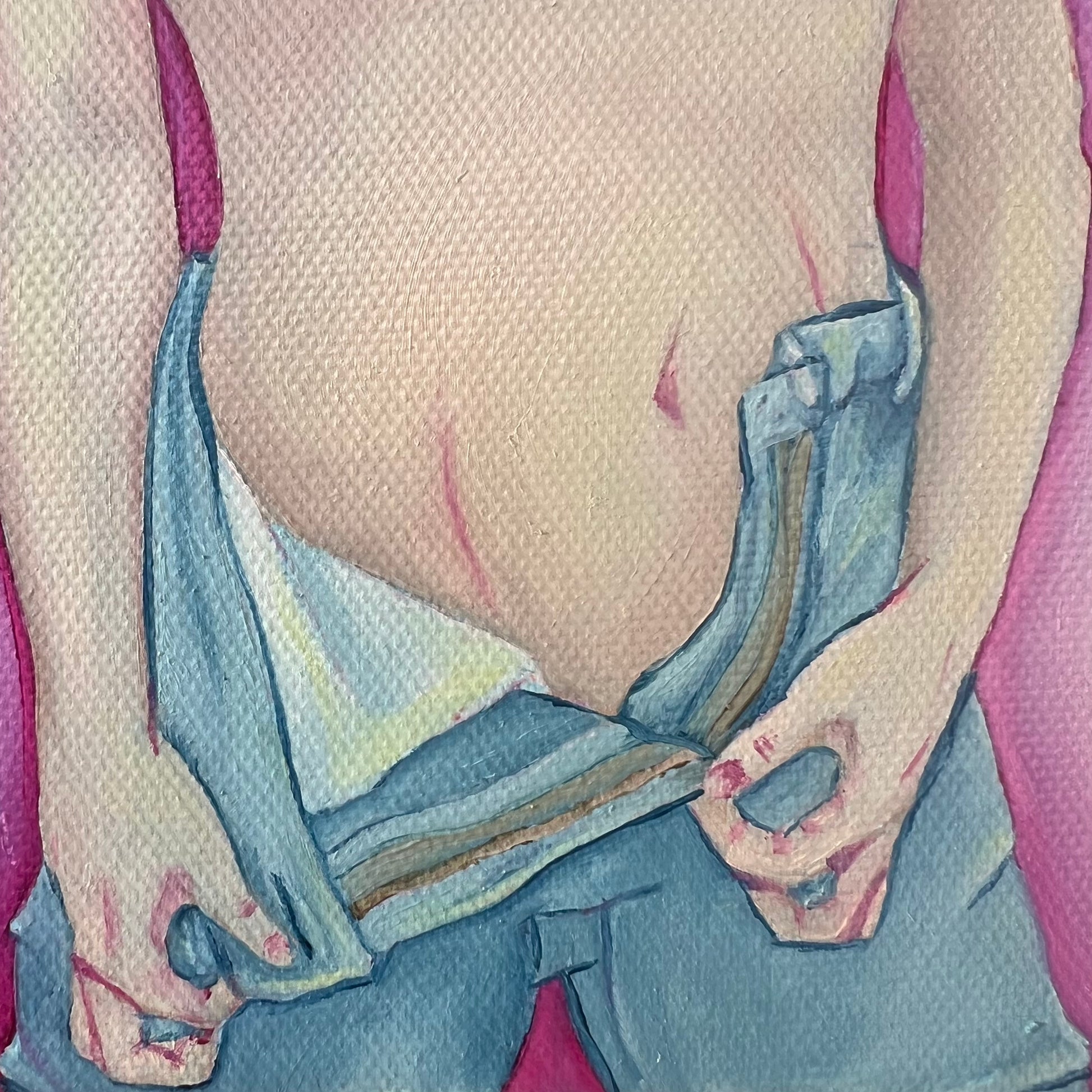 Nothing Comes Between Me and My Thrift Store Jeans is an oil painting of a person unzipping their jeans. They are wearing nothing else.